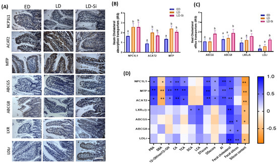 Ileal Niemann–Pick C1-Like 1 (NPC1L1), acetyl-coenzyme A acetyltransferase-2 (ACAT2),microsomal triglyceride transfer protein (MTP), liver X receptor transcription factor (LXRα/β), ATP-binding cassette subfamily G members 5 (ABCG5) and 8 (ABCG8) and low-density lipoprotein receptor (LDLr) in the early-stage diabetes (ED), late-stage diabetes (LD) and Si-RM consumption in late-stage diabetes (LD-Si) groups. (A) Representative images of immunohistochemistry labeling of ileal NCP1L1, ACAT2, MTP, LXRα/β, ABCG5, ABCG8 and LDLr. Scale bar: 50 µm. (B) Immunoreactivity score (IRS) of ileal NCP1L1, ACAT2 and MTP. (C) IRS of ileal LXRα/β, ABCG5, ABCG8 and LDLr. Values expressed as mean ± SD. Different letters (a < b) indicate significant differences between groups, Kruskal–Wallis and Dunn’s tests (p < 0.05). (D) Heatmap showing correlations between NCP1L1, ACAT2, MTP, LXRα/β, ABCG5, ABCG8 and LDLr proteins with PBA, SBA, 12α-OHBA/non-12α-OHBA ratio, CA, TCA, DCA, LCA, DTscore, DDscore, atherogenic index (AI), fecal cholesterol, fecal daily silicon and cecal mucosa silicon contents. The color intensity of the heatmap represents the degree of association: Blue, positive association; Orange, negative. * Denotes adjusted: * p < 0.01, ** p < 0.001. Pearson’s or Spearman’s correlation coefficient values were used for the matrix.