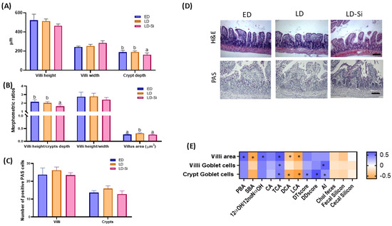 Morphometric parameter and number of goblet cells of the ileal epithelium in early-stage diabetes (ED), late-stage diabetes (LD) and Si-RM consumption in late-stage diabetes (LD-Si) groups. (A) Villi height, width and crypt depth (µm). (B) Villi height/width and villi height/crypt ratios and villi area (µm3). (C) Number of goblets cells of villi and crypts from periodic acid–Schiff staining (PAS) slices. Values expressed as mean ± SD. Different letters (a < b) indicate significant differences between groups, ANOVA, Bonferroni post hoc test (p < 0.05). (D) Representative images of histochemistry by hematoxylin and eosin (H&E), scale bar: 100 µm and PAS staining, scale bar: 50 µm. (E) Heatmap showing correlations between villi area, number of villi goblet cells and crypt goblet cells with PBA, SBA, 12α-OHBA/non-12α-OHBA ratio, CA, TCA, DCA, LCA, DTscore, DDscore, atherogenic index (AI), fecal cholesterol, fecal daily silicon and cecal mucosa silicon contents. The color intensity of the heatmap represents the association degree: Blue, positive association; Orange, negative. * Denotes adjusted: * p < 0.01. Pearson’s correlation coefficient values were used for the matrix.