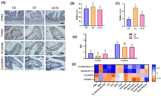 Intestinal proliferation and apoptosis were measured by PCNA labeling index (PCNA-LI) (Figure 7B) and TUNEL labeling index (TUNEL-LI) (Figure 7C), respectively. The LD group showed increased epithelial turnover in the ileal mucosa, with the highest PCNA-LI in the crypts (15.3%, p = 0.01) and TUNEL-LI in the villi (169.2%, p < 0.0001) with respect to the ED group. The LD-Si group displayed lower levels in both PCNA-LI (15.6%, p = 0.01) and TUNEL-LI (37.9%, p = 0.004) compared to LD rats, but only reached ED values for PCNA-LI, maintaining a higher TUNEL-LI signal. As indicated by the significant Pearson coefficients, PCNA-LI and TUNEL-LI were positively affected by PBA, 12α-OHBA/non-12α-OHBA ratio TCA and DTscore (ranged values, r = 0.852 to r = 0.636, p = 0.001–0.026) and negatively by SBA (PCNA-LI r = −0.616, TUNEL-LI r = −0.677, p = 0.006–0.020). Additionally, PCNA-LI was positively correlated to fecal silicon content and negatively correlated to silicon content in the cecum (p = 0.001).
