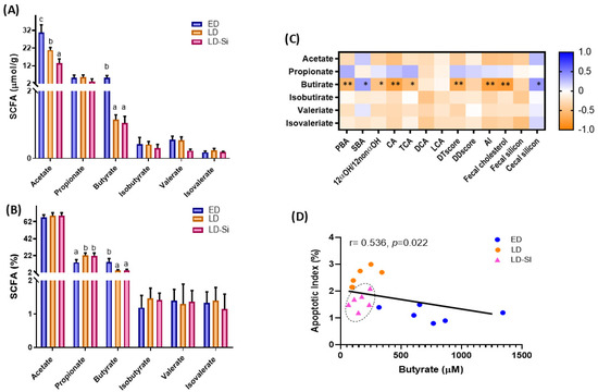 Short chain fatty acid (SCFA) content in cecum of early-stage diabetes (ED), late-stage diabetes (LD) and Si-RM consumption in late-stage diabetes (LD-Si) groups. (A) SCFA profile (µmol/g). (B) Percentage of SCFA. Values expressed as mean ± SD. Different letters (a < b < c) indicate significant differences between groups, ANOVA, Bonferroni post hoc test (p < 0.05). (C) Heatmap showing correlations between acetate, propionate, butyrate, isobutyrate, valerate and isovalerate with PBA, SBA, 12α-OHBA/non-12α-OHBA ratio, CA, TCA, DCA, LCA, DTscore, DDscore, atherogenic index (AI), fecal cholesterol, fecal daily silicon and cecal mucosa silicon contents. The color intensity of the heatmap represents the degree of association: Blue, positive association; Orange, negative. * Denotes adjusted: * p < 0.01, ** p < 0.001. Pearson’s correlation coefficient values were used for the matrix. (D) Pearson correlation between apoptotic index as TUNEL-LI (%) and butyrate content (µmol/g) showing Pearson’s coefficients and significance (p < 0.05). LD-Si group values are marked in the circle.