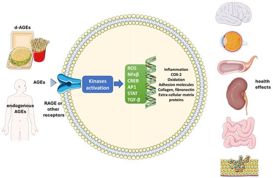 - Vlassara, H.; Cai, W.; Crandall, J.; Goldberg, T.; Oberstein, R.; Dardaine, V.; Peppa, M.; Rayfield, E.J. Inflammatory Mediators Are Induced by Dietary Glycotoxins, a Major Risk Factor for Diabetic Angiopathy. Proc. Natl. Acad. Sci. USA 2002, 99, 15596–15601. [Google Scholar] [CrossRef]