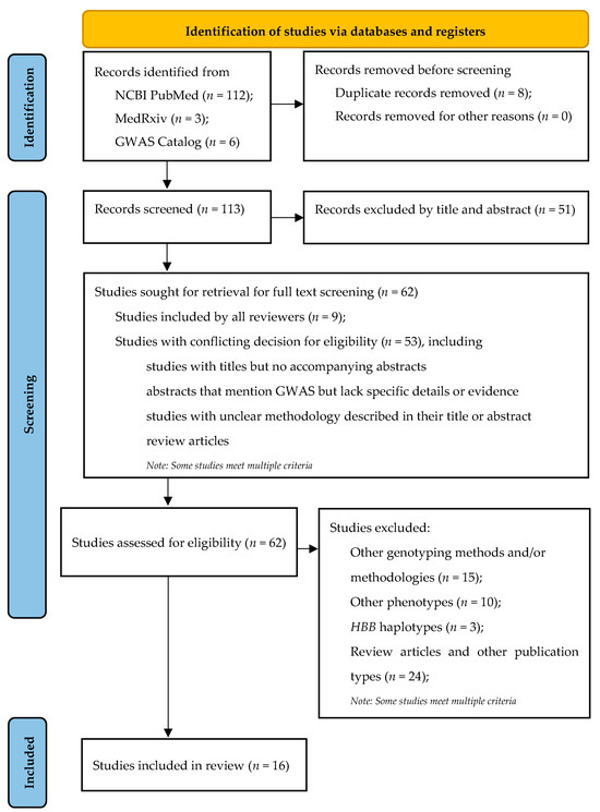 Conversely, articles were excluded from the systematic review if they: (i) were published in a language other than English, (ii) reported only p-values without effect estimates, (iii) included SNP panels limited to candidate genes, (iv) reported βS globin haplotype-trait associations, and (v) examined cohorts undergoing transfusion therapy or pharmacological treatment with HbF-inducing agents. Evidence from expert opinion commentaries, websites, and master’s or doctoral theses were also excluded from consideration.