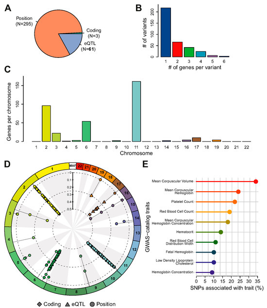 Gene mapping and functional annotation of the selected SNP set (found in ≥two papers) using snpXplorer. (A) Pie plot shows variant annotations, classified as coding (green), eQTL (blue), or annotated by their genomic position (orange). It informs about variant effect, i.e., a direct effect on protein sequence in the case of coding SNPs, or a regulatory effect in the case of eQTLs or intergenic SNPs. (B) Barplot shows the number of genes associated with each SNP. Variant-gene mapping might associate multiple genes to a single SNP, depending on the effect and position of each SNP. (C) Plot shows the chromosomal distribution of SNPs. (D) The circular summary figure shows the type of annotation of each SNP used as input (coding, eQTL, or annotated by their positions) as well as each SNP’s minor allele frequency (MAF) and chromosomal distribution (numbers 1–22 on the outer ring). (E) Fraction of SNPs associated with traits from the GWAS Catalog, estimated by averaging fractions across 500 iterations of sampling one gene per variant to correct for multiple genes being associated with a single variant.