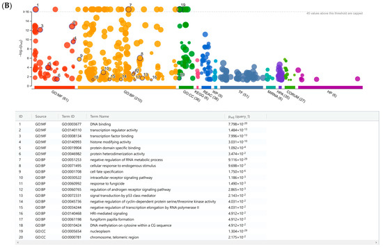 - Kolberg, L.; Raudvere, U.; Kuzmin, I.; Adler, P.; Vilo, J.; Peterson, H. g:Profiler—Interoperable web service for functional enrichment analysis and gene identifier mapping (2023 update). Nucleic Acids Res. 2023, 51, W207–W212. [Google Scholar] [CrossRef] [PubMed]