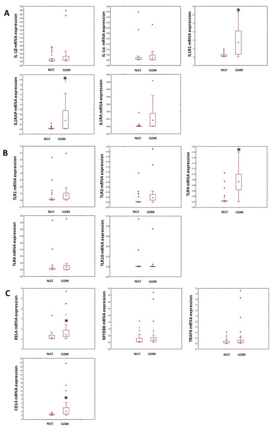 A box and whisker plot showing the absolute mRNA expression of elements of the IL-1β pathway (Panel (A)), Toll-like receptors (Panel (B)) and elements of the intracellular signal transduction pathway (Panel (C)), as assessed by RQ-PCR. The results are presented as the ratio of the gene of interest vs. internal control expression (β2-M; β2-microglobulin); * p < 0.05. The dot in the middle of the box represents the median value, and the single dots outside the box represent outliers. NGT (explants from patients with normal glucose tolerance), GDM (explants from patients with gestational diabetes mellitus), IL-1β (interleukin-1β), IL-1α (interleukin-1α), IL1R1 (interleukin 1 receptor), IL1RAP (interleukin 1 receptor accessory protein), IL1RA (interleukin-1 receptor antagonist), TLRs 1, 2, 4, 6, 10 (Toll-like receptors 1, 2, 4, 6, 10), RELA (nuclear factor NF-kappa-B p65 subunit), MYD88 (myeloid differentiation primary response 88), TRAF6 (TNF receptor-associated factor 6) and CD14 (myeloid cell-specific leucine-rich glycoprotein).