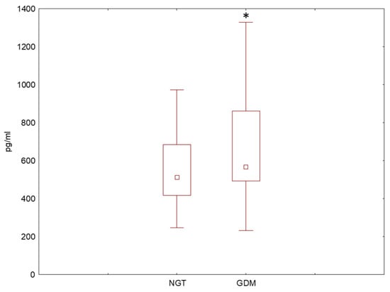 A box and whisker plot showing the concentration of IL1RA in the peripheral blood plasma of GDM and NGT women as assessed by an immunoenzymatically assay. * p < 0.05. The dot in the middle of the box represents the median value. NGT (peripheral blood from patients with normal glucose tolerance), GDM (peripheral blood from patients with gestational diabetes mellitus), IL1RA (interleukin-1 receptor antagonist).