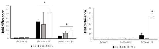 The effects of placental tissue (left) and BeWo cell (right) stimulation by pro-inflammatory molecules, IL1-β (20 ng/mL) and LPS (100 ng/mL) on relative mRNA expression of IL-6, IL-1β and TNF-α. The data are presented as the fold difference, where 1 = unstimulated control samples. * p < 0.05 compared with unstimulated controls. All experiments were repeated at least three times with similar results. IL-6 (interleukin 6), IL-1β (interleukin 1β), TNF-α (tumour necrosis factor α), LPS (lipopolysaccharide).