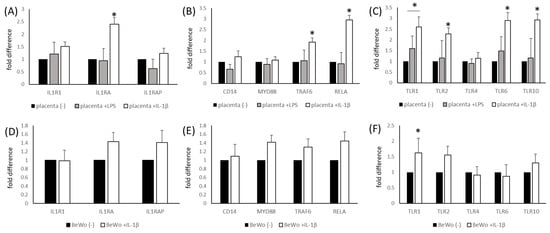 The relative mRNA expression of elements of the IL-1β system (Panels (A) and (D)), Toll-like receptors (Panels (C) and (F)) and elements of intracellular signal transduction pathways (Panels (B) and (E)), as assessed by RQ-PCR in placental tissue (Panels (A–C)) and BeWo cells (Panels (D–F)) stimulated by LPS (100 ng/mL) or IL-1β (20 ng/mL). The data are presented as fold differences, where 1 = unstimulated controls. * p < 0.05 compared with unstimulated controls. IL-1β (interleukin 1β), IL1R1 (interleukin 1 receptor), IL1RAP (IL1R1 accessory protein), IL1RA (IL1R1 antagonist), TLRs 1, 2, 4, 6 and 10 (Toll-like Receptors 1, 2, 4, 6 and 10), RELA (nuclear factor NF-kappa-B p65 subunit), CD14 (myeloid cell-specific leucine-rich glycoprotein), MYD88 (myeloid differentiation primary response 88), TRAF6 (TNF receptor-associated factor 6) and LPS (lipopolysaccharide).