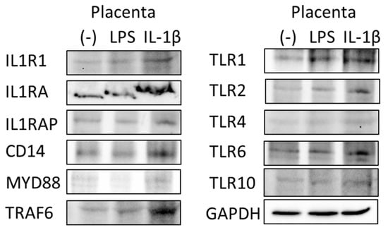 As shown in Figure 4, LPS- and IL-1β-stimulated placental explants and BeWo cells showed the characteristically altered expression of the following elements of the IL-1β receptor pathway: IL-1 receptor type 1 (IL1R1), IL1 receptor antagonist (IL1RA), IL1 receptor accessory protein (IL1RAP), TLRs (TLR1, 2, 4, 6 and 10) and intracellular signal transduction machinery (CD14, MYD88, TRAF6 and RELA). In our experiment, IL-1β stimulation produced the strongest effect, significantly elevating the expression of IL1RA, TRAF6, RELA, TLR1, TLR2, TLR6 and TLR10 in placental explants (Figure 4A–C). We performed a similar experiment on the BeWo cell line, but these cells, as previously mentioned, did not respond to LPS stimulation and showed minimal changes (not statistically significant) in genetic expression; however, the response to IL-1β was significant in TLR1 (Figure 4D–F). These results were recaptured at the protein level in Western blots (Figure 5).