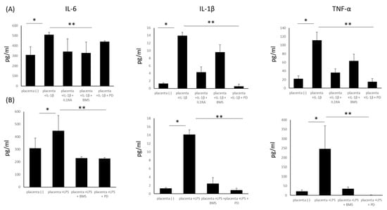 Measurement of pro-inflammatory cytokine concentrations in supernatants collected from placenta explants stimulated with IL-1β (20 ng/mL) (Panel (A)) or with LPS (100 ng/mL) (Panel (B)) and with selected inhibitors: recombinant IL1RA (100 ng/mL); BMS 345541(12.5 µM)—a highly selective inhibitor of I kappa B kinase that blocks NF-κB-dependent transcription; and a MAPK (mitogen-activated protein kinase) inhibitor—PD184352 (5 µM). * p < 0.05 compared with unstimulated controls. ** p < 0.05 compared with stimulated controls and after the application of inhibitors. IL-1β (interleukin1β), IL-6 (interleukin 6), IL1R (interleukin 1 receptor), LPS (lipopolysaccharide), TNF-α (tumour necrosis factor α), IL1RA (IL1R antagonist).