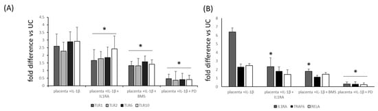 Relative downregulation of mRNA expression of Toll-like receptors 1, 2, 6 and 10 (Panel (A)) and IL1RA, TRAF6 and RELA (Panel (B)) in placental explants stimulated with IL-1β alone or by IL-1β with selected inhibitors. UC (unstimulated controls), expression = 1. * p < 0.05 compared with IL-1β-stimulated samples. TLRs 1, 2, 6, 10 (Toll-like receptors 1, 2, 6, 10), IL-1β (interleukin 1β), IL1RA (IL-1R antagonist), TRAF6 (TNF receptor-associated factor 6), RELA (nuclear factor NF-kappa-B p65 subunit), BMS 345541 (a highly selective inhibitor of I kappa B kinase that blocks NF-κB-dependent transcription), PD184352 (an MAPK (mitogen-activated protein kinase) inhibitor).