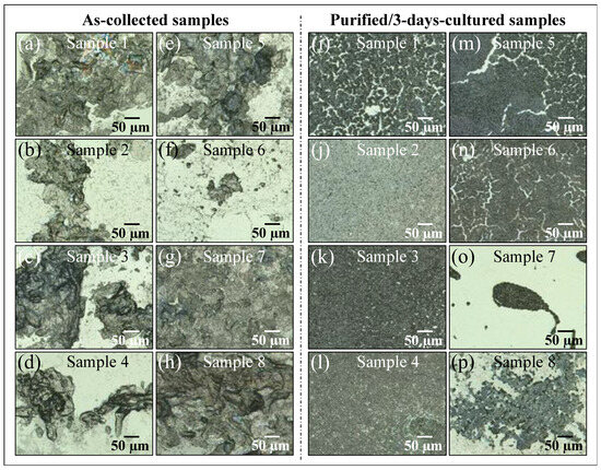 Laser micrographs of oral candidiasis samples: (a–h) clinical samples as collected from patients and (i–p) the same samples after purification and 3-day culture. Abundant presence of biofilm is observed in all as-collected samples, which is partially retained after purification and 3-day culture. Clinical details for all samples are given in Table 1.