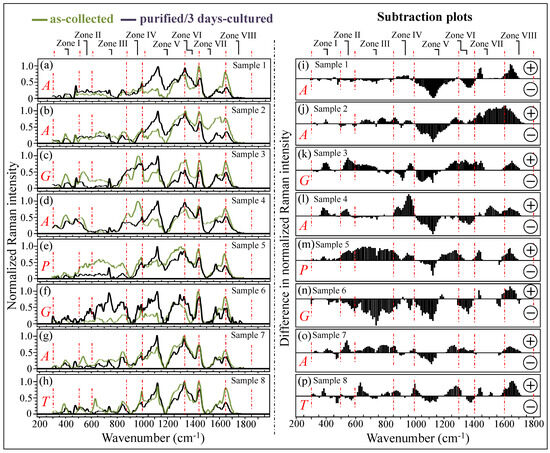Figure 3a–h shows normalized Raman spectra averaged over sets of 10 spectra recorded on all as-collected and purified/3-day-cultured samples (cf. labels in inset). All Raman spectra were collected over the wavenumber interval of 300~1800 cm−1, which was divided into spectral zones I~VIII at increasing wavenumbers (cf. labels in inset). According to the speciation results shown in Figure 2, the labels A, G, P, and T in the inset identify the samples mainly consisting of C. albicans, C. glabrata, C. parapsilosis, and C. tropicalis species, respectively. The additional set of plots in Figure 3i–p (also divided into the same eight spectral zones as above) was obtained upon subtracting the spectra of purified/3-day-cultured samples from those of the respective as-collected samples. The encircled signs + and − (in inset) refer to the positive and negative spectral differences, respectively. As seen from these latter subtraction plots, all clinical samples experienced patterns different from each other, although such patterns also presented some common characteristics in specific spectral zones (e.g., Zones IV, V, and VIII). These similarities in the subtraction plots of Figure 3i–p will be discussed in detail in the following sections.