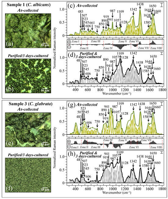 Figure 4 shows the procedure followed for Raman data treatment for two specific samples, one (C. albicans) and three (C. glabrata also including a minor fraction of C. albicans; cf. Table 1). The average Raman spectra include the spectral deconvolution and wavenumber labeling (in cm−1) of selected vibrational signals over the full investigated spectral interval 300~1800 cm−1. High-resolution laser micrographs of as-collected and purified/cultured Sample 1 are given in Figure 4a,b, respectively. The respective (average) Raman spectra (i.e., the same as those shown in Figure 3a) are shown in Figure 4c,d (cf. labels in inset) after deconvolution into Gaussian–Lorentzian sub-bands. The subtraction plot between the two spectra (i.e., the same as that shown in Figure 3i) is also included between Figure 4c,d for easier visualization. Similar characterizations are reported for Sample 3 (C. glabrata), for which high-resolution laser micrographs of as-collected and purified/3-day-cultured samples are shown in Figure 4e,f, respectively. The corresponding average and deconvoluted Raman spectra are given in Figure 4g,h (the same as shown in Figure 3c), together with the corresponding subtraction plot (the same as that shown in Figure 3k). Samples 1 and 3 basically included the same sequence of spectral sub-bands, although the relative Raman intensities were clearly different. Note, in addition, that signals recorded in the same sample before and after purification–culture were also markedly different. Details of spectral deconvolution and differences in relative intensity for selected Raman signals will be discussed later.