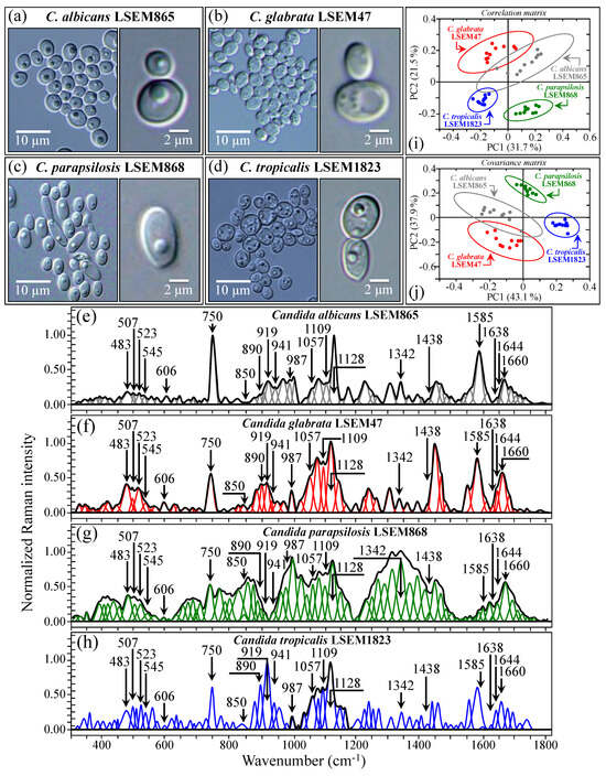 DIC micrographs of C. albicans LSEM865 (a), C. glabrata LSEM47 (b), C. parapsilosis LSEM868 (c), and C. tropicalis LSEM1823 (d) as taken from the respective reference samples (higher magnification DIC images in the respective insets). In (e–h), average (deconvoluted) Raman spectra are given for the above reference samples (cf. labels in inset; (e–h) are replotted from Ref. [7]). The wavenumbers indicated in inset are in cm−1 units (±3 cm−1) and refer to key spectroscopic signals used in Raman analyses. Plots in (i,j) represent three different combinations of PCA loading vectors, which refer to the entire spectral region 300~1800 cm−1 and allow for distinguishing between the above two reference Candida samples upon analyzing the mere morphology of their Raman spectra.