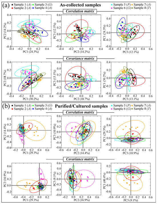 Plots for all as-collected (a) and purified/cultured (b) clinical samples are given for three different combinations of PCA loading vectors with respect to both correlation and covariance matrices (cf. labels in inset). All plots refer to the entire spectral region 300~1800 cm−1. Unlike the case of reference strains (cf. Figure 5i,j), none of the PCA plots, either for as collected or purified/cultured samples, allowed for distinguishing among different Candida species from the mere Raman spectral morphology.