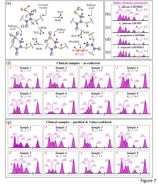 (a) Schematic draft for the suggested mechanism of cysteine degradation by ROS, which ultimately leads to hyperoxidation of sulfenic acid to irreversibly form sulfinic and sulfonic acids [38]. Spectroscopic difference in S–S bond structures observed upon extracting selected Raman bands (cf. text) from the spectra (in Figure 5) of C. albicans LSEM865 (b), C. glabrata LSEM47 (c), C. parapsilosis LSEM868 (d), and C. tropicalis LSEM1823 (e) reference samples are presented. The same procedure is applied to clinical samples in the as-collected (f) and purified/cultured (g) states, respectively (from spectra given in Figure 3a–h; cf. labels in inset). The spectroscopic ratio, RS-S = (I507 + I523 + I545)/I483, which was computed from the areas subtended by the selected Raman signals, gives the sulfide-to-sulfhydryl bond ratio (cf. values in inset). This parameter should, in principle, locate any eventual increase in the population of disulfide bonds in stressed Candida cells (cf. values in inset). However, the overlapping sulfur chemistry of bacterial population and related biofilm structures hamper this approach in the characterization of cells’ stress state. The wavenumbers indicated in inset are in cm−1 units and refer to key spectroscopic signals used in Raman analyses.