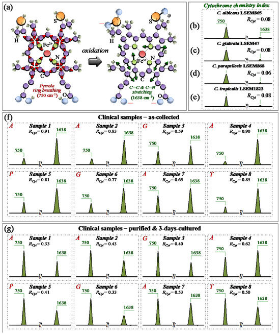 (a) Schematic draft for the mechanism of heme oxidation in cytochrome c, as a consequence of stress accumulation in Candida cells [46]. Spectroscopic differences for selected Raman signals from the heme molecule in the reduced and oxidized state were observed by extracting Raman bands at 750 and 1638 cm−1 from the spectra (in Figure 5) of C. albicans LSEM865 (b), C. glabrata LSEM47 (c), C. parapsilosis LSEM868 (d), and C. tropicalis LSEM1823 (e) reference samples. The same procedure was applied to clinical samples in the as-collected (f) and purified/cultured (g) states, respectively (i.e., from the spectra given in Figure 3a–h; cf. labels in inset). We computed the Raman spectroscopic ratio, RCyt = I1638/(I750 + I1638), from the areas subtended by the selected Raman signals, which is representative of the level of physiological stress in the cells (cf. computed values in inset) [49,50,51,52]. The wavenumbers indicated in inset are in cm−1 units and refer to key spectroscopic signals used in Raman analyses.