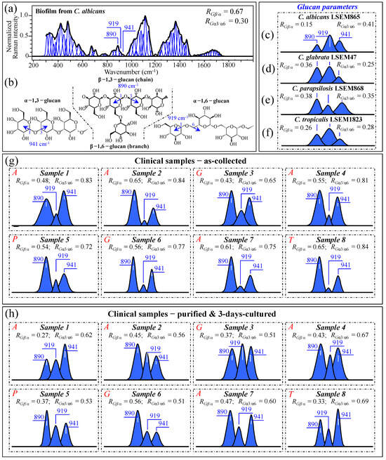 (a) Raman spectrum of the biofilm obtained from culturing C. albicans LSEM865 reference sample and (b) schematic drafts for β–1,3-linked chains (with β–1,6-linked branches), α–1,6–glucans, and α–1,3–glucans with their respective C–O–C glycosidic linkage stretching vibrations found at 890, 919, and ~941 cm−1, respectively (cf. labels in inset). Differences for selected spectroscopic signals were observed by extracting the above three C–O–C Raman bands from the spectra (in Figure 5) of C. albicans LSEM865 (c), C. glabrata LSEM47 (d), C. parapsilosis LSEM868 (e), and C. tropicalis LSEM1823 (f) reference samples. The same procedure was applied to clinical samples in the as-collected (g) and purified/cultured (h) states, respectively (i.e., from the spectra given in Figure 3a–h; cf. labels in inset). The Raman spectroscopic ratios, RGβ/α = I890/(I890 + I919 + I941) and RGα3/α6 = I941/(I919 + I941), were computed from the areas subtended by the selected Raman signals, which located the cell wall glucan composition in terms of α– vs. β–glucans and α–1,3- vs. α–1,6-linked glucans ratios, respectively (cf. computed values in inset). The wavenumbers indicated in inset are in cm−1 units and refer to key spectroscopic signals used in Raman analyses.