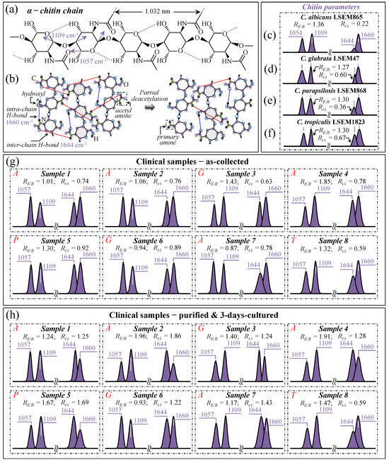 Schematic drafts of (a) the molecular structure of α–chitin chain and (b) the tertiary structure of α–chitin undergoing partial deacetylation; fingerprint vibrations and related wavenumbers are given in inset to both drafts. Spectroscopic differences in the selected Raman bands (cf. text) from the spectra (in Figure 5) are given for C. albicans LSEM865 (c), C. glabrata LSEM47 (d), C. parapsilosis LSEM868 (e), and C. tropicalis LSEM1823 (f) reference samples. The same fingerprint bands are retrieved from the deconvolution of spectra from clinical samples in the collected (g) and purified/cultured (h) states, respectively (i.e., from the spectra given in Figure 3a–h; cf. labels in inset). The spectroscopic ratios, RE/R = I1109/I1057 and Ri/i = I1644/I1660, referred to as esterification and deacetylation ratios, respectively, were computed from the areas subtended by the selected Raman signals (cf. values in inset). These parameters should, in principle, locate eventual increases in cell wall rigidity in Candida cells from clinical samples compared to reference samples. However, the carbohydrate structure of bacterial biofilms overlaps the signals and hampers this spectroscopic approach in the characterization of cell wall structures (cf. text). The wavenumbers indicated in inset are in cm−1 units and refer to key spectroscopic signals used in Raman analyses.