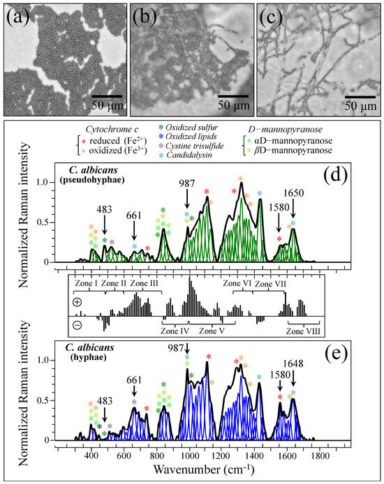 In order to substantiate and rationalize the above structural notions in terms of Raman parameters, we recorded Raman spectra from standard C. albicans LSEM865 at increasing steps of yeast-to-hypha morphogenic transformation (induced in vitro by genotoxic stress; cf. optical micrographs in Figure 11a–c, respectively). The spectra recorded for the pseudohypha (intermediate) and hypha (final) configurations are shown in Figure 11d,e, respectively. They should be compared with the reference (initial) yeast spectrum in Figure 5e. Spectral differences were computed upon subtracting the spectrum of pseudohyphae (in (d)) from that of hyphae (in (e)), as shown in the subtraction plot between Figure 11d,e. In this basic in vitro experiment, the spectral intensity recorded for pseudohyphae and hyphae samples in Zones IV and V showed a tendency to become increasingly stronger compared to that recorded for the yeast sample in the same zones. Chitin signals fall in these spectral zones. Therefore, their increase indeed links to a volumetric increase in chitin content upon morphogenic switching, which is in agreement with the literature [100,101,102]. Note also that the in vitro cultures in this basic experiment lacked the presence of any commensal bacterium. Therefore, the observed difference in Zones IV and V should be ascribed to the structural differences intrinsic to the cell walls.