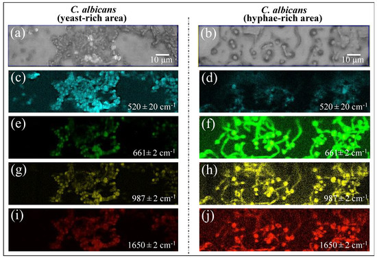 Selected zones in the as-collected samples were relatively low in biofilm and predominantly included C. albicans cells in yeast (a) and hyphal (b) morphology. Raman imaging was applied at spectral wavenumbers 520 ± 20, 661 ± 2, 987 ± 2, and 1650 ± 2 cm−1 (in (c/d), (e/f), (g/h), and (i/j), respectively), which represent sulfur chemistry (the first signal at 520 ± 20 cm−1) and candidalysin main signals (the latter three signals). Raman imaging gives a vivid example of how morphogenic shift into the hyphal form affects the chemical composition of cells.