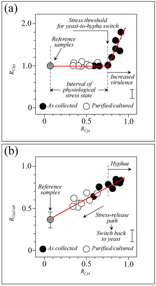Figure 14 shows the reciprocal dependences of the RGα3/α6, RCyt, and RClys parameters, which hint at peculiar aspects of sample diagnostics. In (a), a plot is given of the virulence factor, RClys, as a function of the physiological stress factor, RCyt, while (b) gives the cell wall structural parameter, RGα3/α6, as a function of the same abscissa RCyt. Both plots include data from clinical samples before and after the purification–culture procedure in comparison with data from the reference Candida clades (cf. legends in inset). The RClys vs. RCyt plot (in Figure 14a) suggests the existence of an interval of the physiological stress state with a threshold value (RCyt~0.75) above which the Candida cells sharply increase their virulence upon switching into hyphae and producing candidalysin. The majority of the clinical isolates trespassed such a threshold, while all samples after purification–culture turned back to a state of physiological stress. On the other hand, the RGα3/α6 vs. RCyt plot (in Figure 14b) follows a linear trend over the entire interval of stress enhancement. This behavior can be interpreted as a passive reaction of Candida cells to the environmental burden, which is limited to self-protection.