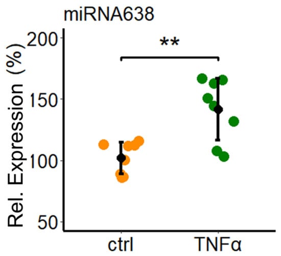 TNF-α upregulates the expression of miR638 in PCs. The sub-confluent monolayers of PCs were treated with TNF-α (10 ng/mL) alone or with a vehicle (ctrl) for 24 h. Subsequently, reverse transcription of isolated total RNA was performed and the expression levels of miR638 were quantified by PCR using the TaqMan miRNA assay kit. Expression levels were normalized to internal controls U44 and U48. Experiments were performed at least three times in triplicates or duplicates, and the data represent mean ± SD. ** p < 0.05, compared to control.