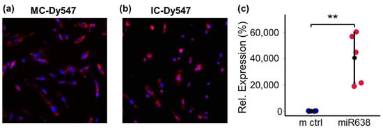Next, we determined whether miR638 modulates PC migration. To achieve this and to assess whether miR638 mediates the effects of TNF-α on PC migration, we transfected PCs with miR638 mimics and/or its anti-miR (inhibitors) to increase or decrease miR levels, respectively. As a first step, we assessed the transfection efficiency of PCs after transfecting the cells with Dy547-labelled controls and through visualization with fluorescent microscopy (Figure 2a,b). Additionally, the levels of miR in the cells were determined by means of quantitative reverse transcription PCR after the transfection of the cells with the corresponding mimics (Figure 2c). Compared to the vehicle-treated control, the robust expression of miR638 was achieved with increase in relative expression from 100 ± 5.46 in the control to 40,605 ± 19,350 (mean ± SD; p < 0.01).