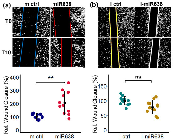 miR638 induces PC migration. PCs were transfected with miR638 or scrambled control (m ctrl) (a) and with miR638 inhibitor (I-miR638) (b). Cells were allowed to recover for 48 h before the scratch wound was induced and migration was assessed 10 h thereafter. Panel (a,b) also depict representative images of PC migration in response to miR638 at time (T) T0 and T10. Experiments were performed three times in triplicate or quadruplicate, and data represent mean ± SD; ns p > 0.05, p < 0.05 **.