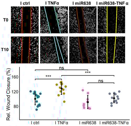 Inhibition of miR638 prevents TNF-α-induced migration of PCs. Cells were transfected with anti-miR (I miR638) or scrambled control (I ctrl) and left to recover for 48 h before a scratch-wound assay was performed in presence or absence of TNF-α (10 ng/mL). Wound closure was assessed after 10 h and representative contrast adjusted images (for clarity) are shown at T0 and T10. Experiments were performed at least three times with four or five replicates, and data represent mean ± SD. ns p > 0.05, *** p < 0.001.