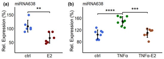 E2 downregulates basal as well as TNF-α-induced expression of miR638 in PCs. Cells were treated with E2 (10−8 M) for 24 h (a) and with TNF-α (10 ng/mL) alone or in combination with E2 (10−8 M) or vehicle (ctrl) for 24 h (b). The reverse transcription of isolated total RNA was performed and the expression levels of miR638 were assessed by PCR, using the TaqMan miRNA assay kit. Expression levels were normalized to internal controls U44 and U48. Experiments were performed at least three times in duplicates or triplicates, and the data represents mean ± SD. ** p < 0.05, *** p < 0.01, **** p < 0.001 compared to control or TNF-α.