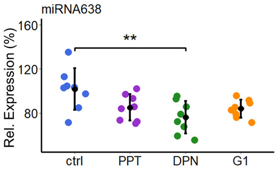 We further determined the involvement of estrogen receptors in mediating the effects of E2 on miR638 expression. We performed quantitative reverse transcription-PCR (qRT-PCR) in total RNA extracted from PCs treated with the three ER agonists: PPT (ER-α agonist), DPN (ER-β agonist), and G1 (GPER agonist). The expression levels of miR638 were significantly downregulated only by the specific ER-β agonist (by 21%, p < 0.01), while no statistically significant effects of ER-α and GPER agonists were observed (Figure 6).
