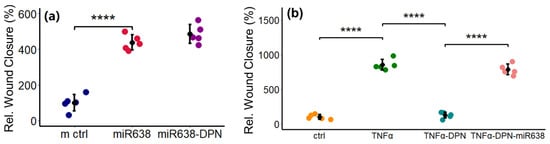 ER-beta inhibits TNF-α-induced PC migration by downregulating miR638 expression. Panel (a) depicts the modulatory effects of DPN on migration of PCs transfected with miR638. PCs transfected with miR638 were treated with or without DPN (10−8 M) and wound closure was assessed after 10 h. Panel (b) depicts the migration of PCs treated with TNF-α (10 ng/mL) in presence or absence of ER-β agonist DPN (10−8 M). DPN prevented TNF-α-stimulated PC migration. Panel (a) also shows that the inhibitory effects of DPN on TNF-α-induced PC migration are lost in PCs with the ectopic expression of miR638. PCs transfected with or without miR638 were allowed to recover for 12 h and subsequently the scratch-wound assay was performed in the presence or absence of TNF-α (10 ng/mL); TNF-α + DPN (10−8 M); or TNF-α + DPN (10−8 M) + miR638. Experiments were performed with a set of five for each treatment and the means of the three locations of a scratch were used to assess the changes. Data represent mean ± SD. **** p < 0.0001 compared to control, TNFα or TNFα + DPN.