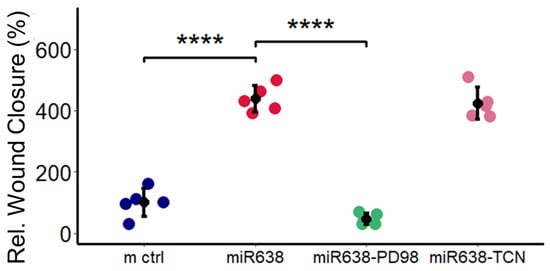 After confirming the potency of our transfection method, we investigated the pro-migratory actions of miR638 in PCs by employing wound healing assays. In this context, scratch assays were performed 48 h after transfecting the PCs with mimics and inhibitors for miR638. As shown in Figure 3a, we observed a significant increase in wound closure in PCs transfected with miR638 mimics from 100% in mimic-control to 206% in PCs transfected with miR638 mimic. Furthermore, as shown in Figure 3b, the inhibition of miR638 slightly decreased migration but not significantly.