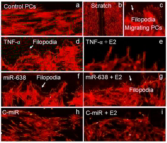 Changes in PC morphology and actin dynamics drive PC migration. To assess whether TNF-α and miR638 promote PC migration by modulating actin dynamics, we stained PCs with ActinRed 555 and assessed morphological changes in migrating PCs on the outer edge of the scratch. Representative photomicrographs in Figure 10a depict actin positive non-migrating PCs, whereas Figure 10b depicts a scratch in actin-stained PCs. Figure 10c shows filopodia-like structures (marked with white arrows) in migrating PCs at a higher magnification on the outer edge of the scratch. The qualitative assessment of PCs treated with TNF-α showed the presence of filopodia-like structures (white arrows) in the absence (Figure 10d) but not in the presence of E2 (Figure 10e). Similar to TNF-α, filopodia-like structures (white arrows) were present in PCs treated with miR638 (Figure 10f); however, in contrast to TNF-α, E2 did not modulate the structural effects of miR638 on PCs and the presence of filopodia-like structures Figure 10g). In PCs transfected with control–miR and treated with or without E2, no significant changes in actin or morphology were observed (Figure 10h,i).