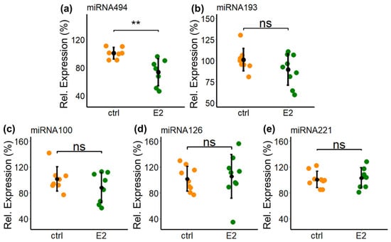E2 on basal expression of other miRs in PCs. E2 downregulates the basal expression of miR494 (a) but not miR193 (b), miR100 (c), miR126 (d) and miR221 (e). PCs grown to sub-confluence were treated with E2 (10−8 M) for 24 h and subsequently lysed for qRT-PCR. Reverse transcription of isolated total RNA was performed and expression levels of various miRs were assessed by real-time PCR using the TaqMan miRNA assay kit. Expression was normalized to internal controls U44 and U48. Experiments were performed three times in triplicates or duplicates, and data represent mean ± SD. ** p < 0.01; ns—not significant.