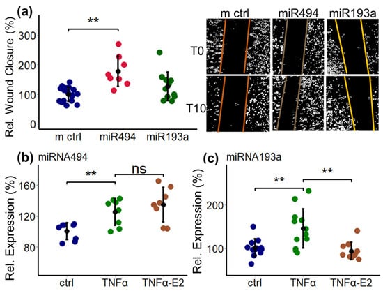 Effects of miR494 and miR193a on PC migration and the modulatory effects of E2 on their TNF-α-stimulated expression. Transfection with miR494 but not with miR193a induces PC migration (a). PCs were allowed to recover 48 h after transfection (with miR494 or miR193a) before the scratch wound was induced and migration was assessed 10 h afterwards. Panel (a) also depicts representative contrast adjusted images (for clarity) of PC migration in response to miR494 and miR193a at time (T) T0 and time T10. Panels (b,c) depict the modulatory effects of E2 on the TNF-α (10 ng/mL)-induced expression of miR494 and miR193a in PCs. Treatment with E2 (10−8 M) for 24 h did not modulate the TNF-α-induced expression of miR494 but abrogated its stimulatory actions on miR193a. Experiments were performed three times in triplicate or quadruplicate, and data represent mean ± SD; p < 0.05 **; ns—not significant.