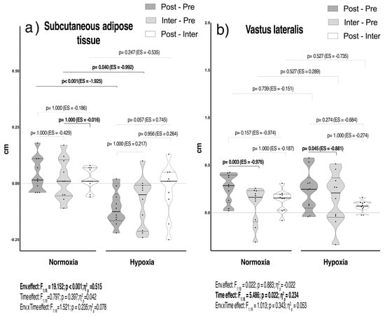 Violin plots for analysis of subcutaneous adipose tissue (a) and vastus lateralis (b) represented as the Δ of resting measurements before (Pre), at weeks 6 (Inter) and 8 (Post) of the RT program. The black line represents the respective group mean; error bars depict 95% CI of the mean. Dots represent single-subject data. p-value (p < 0.05), partial eta squared from ANOVA (η2p), Cohen’s d effect size (ES). ES was calculated as (Δ of resting Post-Pre, Inter-Pre, and Post-Inter) or (HH-N) divided by the pooled standard deviation. Pre: 72 hours before RT the first training session of the RT; Inter: week 6; Post: 72 h after the last training session of the RT.