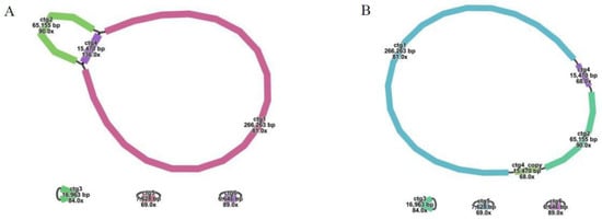 The mitochondrial genome map was constructed utilizing long-read sequencing data, encompassing several circular genomic DNA sequences, as depicted in Figure 1A. In the case of the multi-branch structure composed of ctg1, ctg2, and ctg4, we streamlined it into a linear sequence following the trajectory of ctg1-ctg4-ctg2-ctg4_copy, as illustrated in Figure 1B. Details of each node in the assembly are presented in Table 1. Consequently, we identified four distinct circular chromosomes with lengths of 6646 bp, 7628 bp, 16,963 bp, and 362,358 bp (accession numbers PQ124156, PQ124157, PQ124158, and PQ124159, respectively). The GC content for these chromosomes was determined to be 43.61%, 45.95%, 44.51%, and 43.64%, respectively. The cumulative length of the mitochondrial genome was 393,595 bp, with an overall GC content of 43.73% (Figure 2).