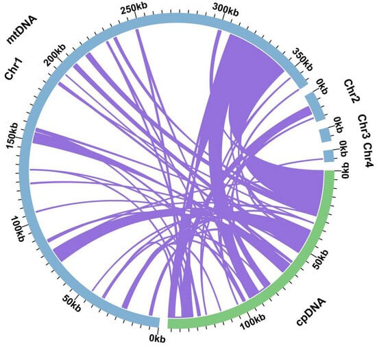 Analysis of gene transfer between the mitochondrial and chloroplast genomes of G. rigescens. The purple lines connecting the arcs indicate the homologous fragments shared between the two genomes.