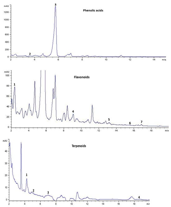 Chromatographic profile of terpenoids, phenolic acids, and flavonoids of methanolic extract of B. cordata.