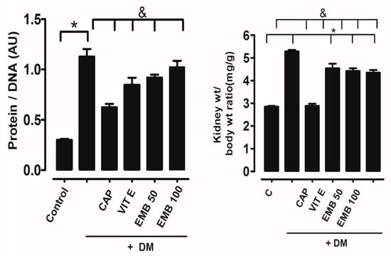 In Figure 2, the relationship was higher for DM (4.21 ± 0.1 mg/g) than the control (3.13 ± 0.08 mg/g). On the other hand, groups that received treatments with captopril (4.34 ± 0.2 mg/g), vitamin E (4.37 ± 0.1 mg/g), EMB at 50 mg/kg (4.61 ± 0.1 mg/g), and EMB at 100 mg/kg (4.76 ± 0.3 mg/g) did not show a reduction in kidney weight, due to the fact that the kidney weight/body weight proportion was observed to be similar to DM (Figure 2).