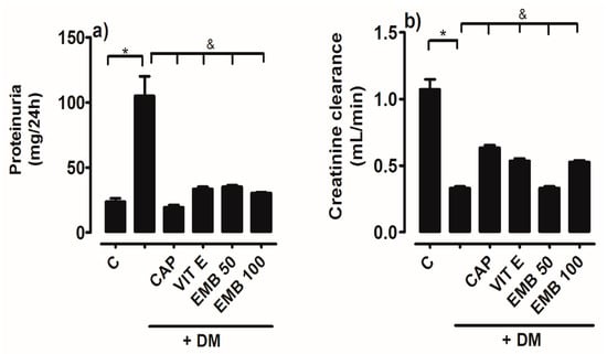 Figure 3a shows the results obtained by quantifying the concentration of proteins excreted in the urine, which increased significantly in DM (68.83 ± 4.7 mg/24 h) compared to the control group (34.43 ± 4.4 mg/24 h). This represents how 68% more proteins were excreted in diabetic rats compared to the control group. In the groups that received the treatments, a significant decrease in protein excretion was observed compared to DM. Another parameter that indicates kidney damage is a decrease in creatinine clearance. In this regard, Figure 3b shows that DM significantly decreased creatinine clearance, which was 0.36 ± 0.02 mL/min, in contrast to the normoglycemic control group (1.01 ± 0.08 mL/min). Creatinine clearance increased in the treated groups compared to DM. The results obtained were DM + Cap (0.62 ± 0.02 mL/min), DM + Vit E (0.52 ± 0.05 mL/min), and DM-EMB 100 mg/kg (0.52 ± 0.05 mL/min).