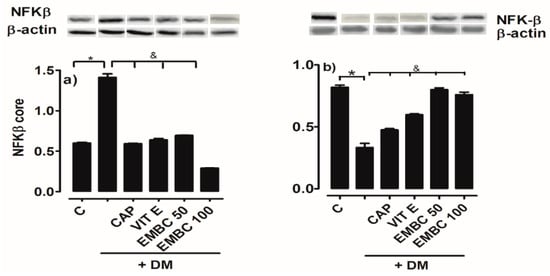Effect of ethanol extract of B. cordata (EMB) on the expression of (a) NFkB core and (b) NFkB cytoplasm in renal cortex of diabetic rats (DM); diabetic + captopril (DM + CAP); diabetic + vitamin E (DM + Vit E); and diabetic + ethanol extract of B. cordata (DM + EMB). Values are expressed as mean ± SEM; n = 5; * p < 0.05 control vs. DM; & p < 0.05 DM vs. treatment.
