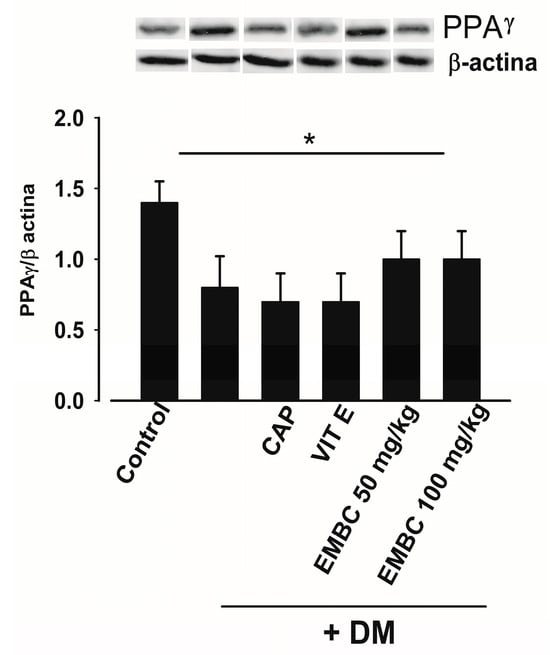The results obtained show that, in DM rats, the expression of transcription factor PPARγ significantly decreased (0.951 ± 0.1 u.a.) compared to the normoglycemic control group (1.49 ± 0.2 u.a.). The DM groups treated with EMB (50 and 100 mg/kg) showed a tendency to increase the expression of PPARγ (0.99 ± 0.07 and 0.98 ± 0.1 a.u., respectively). The DM groups treated with captopril and vitamin E showed similar results to the DM group for DM-Cap (0.884 ± 0.03 u.a) and DM-Vit E (0.942 ± 0.01 u.a) (Figure 5).