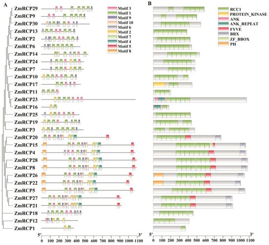 Prediction of conserved motifs and domains of ZmRCP family members in maize. (A) The phylogenetic relationship (left panel) and conserved motifs (right panel) of ZmRCP members are listed. (B) Prediction of conserved domains of ZmRCP members.