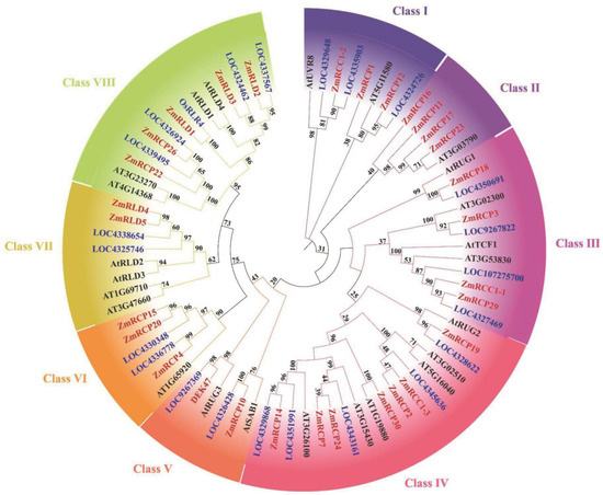 In order to explore the specific phylogenetic relationship of RCP members in maize and other species, we constructed a phylogenetic tree of RCP proteins in three species, including Zea mays, Arabidopsis thaliana, and Oryza sativa. After domain validation of the rice protein sequence downloaded from NCBI, it was found that there are 22 members of the same domain in rice. There are 30 members in maize, 24 members in Arabidopsis, and 23 members in rice, indicating that the number of RCP family members is relatively conservative with no significant expansion (Figure 2). After constructing the tree using the adjacency method, all RCP family members in these three species were clustered into eight classes based on their genetic relationships, from Class I to VIII. In maize, there are two members in Class V, three members in Class I, VI, and VII, four members in Class II and III, five members in Class VIII, and seven members in Class IV (Figure 2).