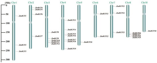 Distribution of ZmRCP family members on chromosomes (Chr). Gray lines indicate the location of the genes on the chromosomes, and the length of the chromosomes is shown on the left scale.