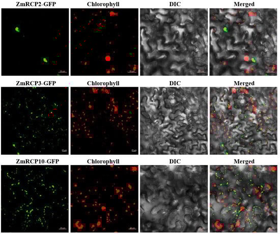 The subcellular localization of ZmRCP2, ZmRCP3, and ZmRCP10 in tobacco leaf epidermal cells. Fluorescence signals from GFP (green) and chlorophyll (red) were imaged under a confocal microscope. Scale bars = 20 µm.
